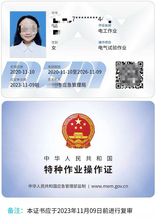 從2020年3月份起,高壓電工證書以新版的證書統(tǒng)一印制,分為電子證和實體證兩種類型,證書由相關(guān)部門頒發(fā),有效期是6年,每3年復(fù)審一次。