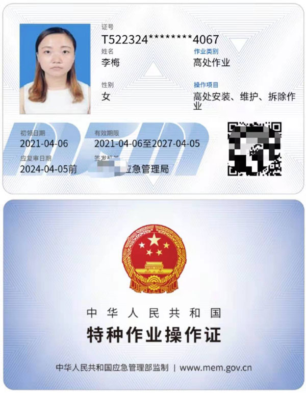 證書適用于利用專用設備進行建筑物內外裝飾、清潔、裝修,電力、電信等線路架設,高處管道架設,小型空調高處安裝、維修,各種設備設施與戶外廣告設施的安裝、檢修、維護以及在高處從事建筑物、設備設施拆除作業。